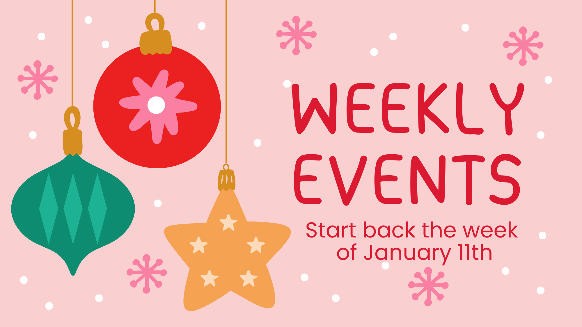 Club Roots, the youth group, and all of our small groups will start back up on January 11th! Take a look at our small groups here.